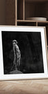 Ein wachsames Erdmännchen steht aufrecht wie der kleine Wächter der Savanne, eingefangen in einem dramatischen Schwarz-Weiß-Moment. Das sanfte Seitenlicht hebt die Textur des Fells und die scharfen Konturen hervor, während der Hintergrund in Dunkelheit fällt. Ein minimalistisches, zeitloses Tierporträt, fotografiert von Greetje van Son. Die Fokussierung auf den Blick verleiht dem Motiv Ruhe und Präsenz.
