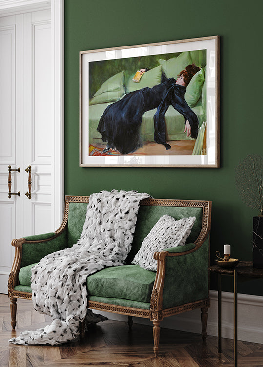 Ein atemberaubendes klassisches Gemälde einer Frau in einem eleganten schwarzen Kleid, die mit einem Buch in der Hand auf einem grünen Sofa ruht. Der Kontrast zwischen der dunklen Kleidung und dem sanften grünen Hintergrund schafft eine schöne visuelle Balance, die Themen wie Entspannung, Kontemplation und literarischen Genuss hervorruft. Perfekt für Liebhaber historischer Porträts und raffinierter Ästhetik.