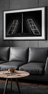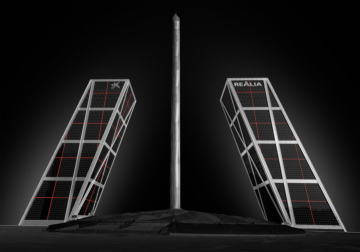 Eine kraftvolle, grafische Hommage an Madrid: Rodrigo Núñez Buj fängt die ikonischen schiefen KIO-Türme ein, die über einen roten Obelisken an der Plaza de Castilla wachen. Monochrome Flächen, scharfe Linien und tiefe Kontraste schaffen dramatische Symmetrie und urbane Ruhe – eine Szene ohne Menschen, nur den Puls der Architektur. – Madrid destilliert.