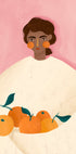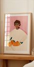 Dieses Kunstwerk zeigt ein stilisiertes Porträt einer Person, die Orangen vor einem pastellrosa Hintergrund hält. Die warmen Töne und das moderne Design betonen Themen wie Natur und Einfachheit und vereinen Ästhetiken aus zeitgenössischer Kunst und Illustration.