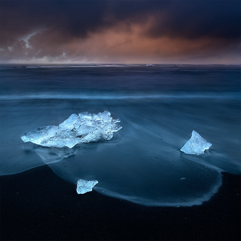 Eiskristalle leuchten auf dem schwarzen Sand Islands, während sanfte, neblige Wellen in einer ruhigen Langzeitbelichtung vorbeiziehen. Der Horizont löst sich im Winterlicht auf und schafft eine meditative Atmosphäre aus Stille und Dramatik. Eine minimalistische, nordische Meereslandschaft, fotografiert von Shenshen Dou am Diamond Beach. Ein Bild des isländischen Winterzaubers, geschaffen für Ruhe und Besinnung.