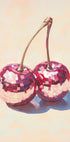 Ein verspieltes und fantasievolles Kunstwerk aus zwei Kirschen, die in glitzernde Discokugeln verwandelt wurden. Mit lebendigen Farben, glänzenden Reflexionen und einem malerischen Stil verbindet dieses Werk Surrealismus und Stillleben auf moderne und skurrile Weise, die jedem Raum Energie und Spaß verleiht.