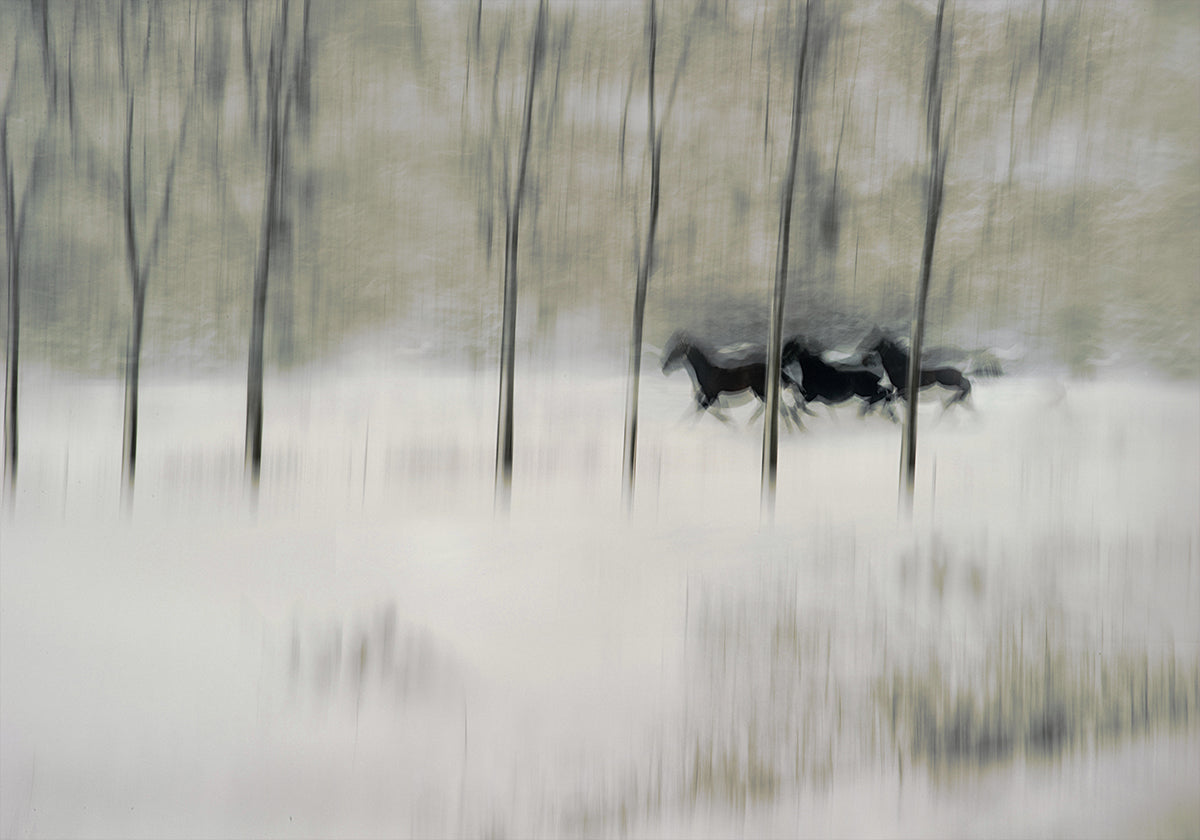 Drei Pferde brechen in dynamischem Galopp durch den Winternebel, eingehüllt in Schneeflocken und sanfte Bewegungsunschärfe. Milan Malovrh fängt die rohe Energie des Augenblicks und die poetische Stille zugleich ein, so dass das Motiv einen fast gespenstischen Glanz erhält – eine minimalistische, nordische Atmosphäre voller Geschwindigkeit, Finesse und Präsenz.