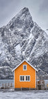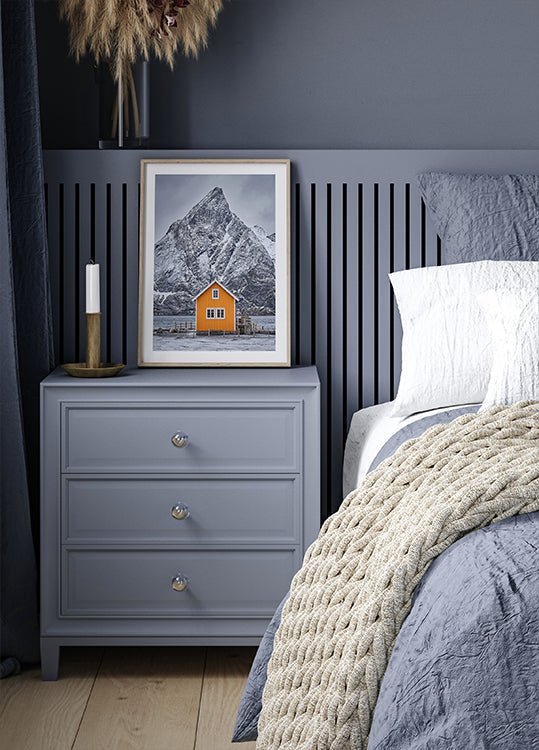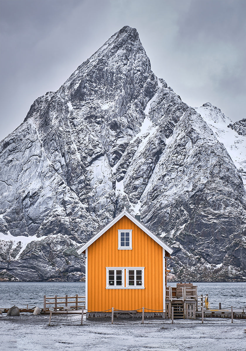 Dieses eindrucksvolle Poster von Hamed Bank zeigt eine einsame gelbe Hütte an einer nordischen Küste, umgeben von schneebedeckten Bergen und einem dunkelblauen Meer. Dramatische Wolken ziehen über den Himmel, während das Winterlicht den Kontrast zwischen der warmen Farbe des Hauses und der kühlen, frostigen Landschaft betont. Eine ruhige, rohe und zeitlose Szene, die zum Nachdenken einlädt.