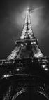 Ein beeindruckendes Schwarz-Weiß-Foto des Eiffelturms, beleuchtet vor dem Nachthimmel in Paris. Der dramatische Blickwinkel und die leuchtenden Lichter fangen die Erhabenheit des Denkmals ein und machen diesen Druck zu einem starken Statement in Innenräumen, die Reisen, Architektur und die zeitlose Romantik der Stadt des Lichts feiern.