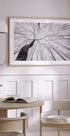 Dieses eindrucksvolle Schwarz-Weiß-Kunstwerk zeigt den Blick vom Waldboden auf hohe Baumstämme und feine Äste, die im Nebel verschwinden. Die Komposition vermischt Geheimnis, Ruhe und die Geometrie der Natur und schafft ein zeitloses Werk, das Stille und die stille Schönheit des Waldes hervorruft.