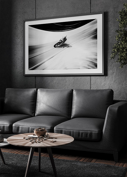 Dieses energiegeladene Schwarz-Weiß-Kunstwerk fängt ein Motorrad bei voller Geschwindigkeit ein, mit dramatischer Bewegungsunschärfe, die Geschwindigkeit und Kraft betont. Der scharfe Kontrast zwischen dem Fahrer und den geschwungenen Kurven erzeugt ein intensives Adrenalingefühl, ein unverwechselbares Werk für Liebhaber von Geschwindigkeit, Motorsport und kühnem Design.