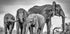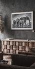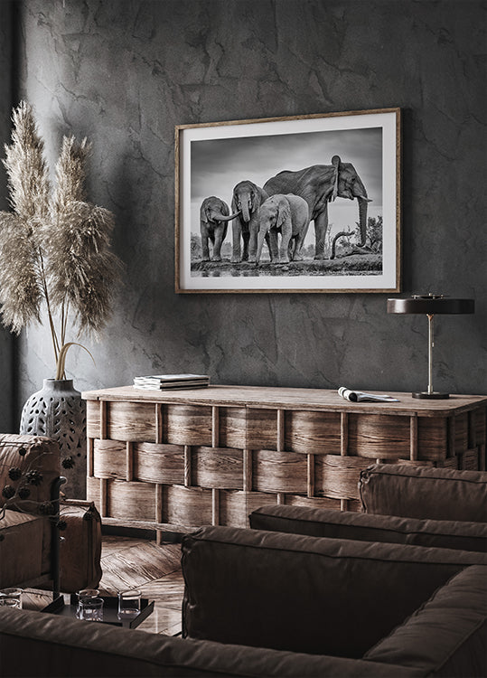 Dieses ausdrucksstarke Schwarz-Weiß-Wildtierfoto zeigt eine Elefantenfamilie, die sich an einer Wasserstelle versammelt hat. Mit liebevollen Interaktionen zwischen jungen und erwachsenen Elefanten spiegelt es Themen wie Schutz, Einheit und die Majestät der Natur wider – ein zeitloses Kunstwerk, das Stärke, Familie und die Wildnis feiert.