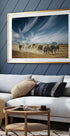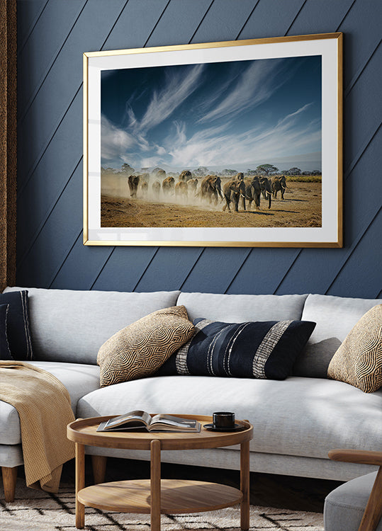 Dieses beeindruckende Tierfoto fängt eine majestätische Elefantenherde ein, die unter weitem Himmel durch die staubige Savanne stürmt. Die Szene strahlt rohe Stärke, Einheit und den wilden Geist Afrikas aus und wird zu einem großartigen Kunstwerk, das die Natur, die Freiheit und die Pracht der Wildnis feiert.