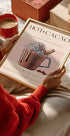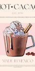 Eine dampfende Tasse cremiger heißer Kakao steht im Mittelpunkt einer Retro-inspirierten Illustration von Nazma Khokhar. Warme Brauntöne, cremige Highlights und sanfte Rosatöne sorgen für eine gemütliche Vintage-Café-Atmosphäre. Elegante Typografie und eine dezente Anspielung auf die 1950er-Jahre suggerieren die klassische Café-Poster-Ästhetik mit einem Hauch mexikanischer Kakaotradition.