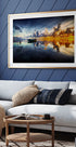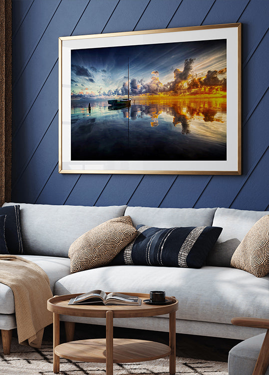 Diese atemberaubende Meereslandschaft zeigt ein einsames Segelboot, das auf ruhigem Wasser unter einem dramatischen Sonnenuntergangshimmel ruht. Die Reflexionen goldener Wolken kräuseln sich über die Wasseroberfläche und verbinden Ruhe mit Erhabenheit. So entsteht ein zeitloses Stück maritimer Kunst, das Frieden, Ruhe und natürliche Schönheit ausstrahlt.