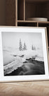 Ein ruhiger, schwarz-weißer Wintertraum: Ein gefrorener Bach schlängelt sich zwischen schneebedeckten Bäumen hindurch, während der Nebel einen weichen Schleier über den tiefen Wald legt. Der hohe, helle Ton und die feinen Kontraste betonen die Poesie der Kälte und den Rhythmus der Natur. Foto von Daniel Řeřicha aus dem Erzgebirge, Tschechien. Eine zeitlose Landschaft, in der sich Kälte und Klarheit in stiller Poesie treffen.