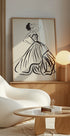 Eine anmutige Strichzeichnung einer Frau in einem fließenden Kleid, eingefangen in einer zeitlosen und stilvollen Pose. Die minimalistischen schwarzen Linien auf einem sanften beigen Hintergrund verleihen dem Kunstwerk eine schicke Modeillustrations-Atmosphäre – perfekt für Kleiderschränke, Studios oder moderne Galeriewände.