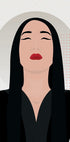 Ein beeindruckendes Porträt einer Geisha mit wallendem schwarzem Haar, eingefangen in einer anmutigen Pose mit geschlossenen Augen und kräftigen roten Lippen. Der minimalistische Stil und die klaren Linien strahlen Eleganz und Stärke aus und machen es zu einer perfekten Ergänzung für japanische, kulturelle oder moderne Innenräume.