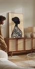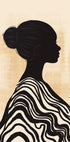 Eine raffinierte Illustration des Profils einer Frau in tiefschwarzer Silhouette, die einen fließenden Stoff mit Wellenmuster trägt. Der warme beige Hintergrund und der minimalistische Stil verleihen dem Kunstwerk eine zeitlose und raffinierte Ausstrahlung – perfekt, um einem Wohnzimmer, Schlafzimmer oder einer Galeriewand Eleganz zu verleihen.