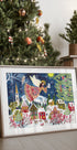„Engel des Friedens“ von Caroline Bonne Müller zeigt eine stille Winternacht: Ein leuchtender Engel mit Heiligenschein und breiten Flügeln schwebt über einem verschneiten Dorf, während sanfte Schneeflocken fallen. Tauben und eine Eule folgen im Flug, und ein friedlicher Hirsch mit wunderschönem Geweih steht unter dem Mond, getaucht in nordische Ruhe. Eine poetische Hommage an Hoffnung, Winterzauber und stille Freude.