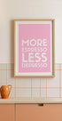 Ein verspieltes, minimalistisches Typografie-Poster mit weißem Text auf einem zartrosa Hintergrund. Das lustige Zitat „More Espresso Less Depresso“ bringt Humor und Motivation, perfekt für Kaffeeliebhaber und moderne Inneneinrichtung. Ein lustiges Statement für Küchen, Cafés oder Büros.