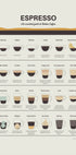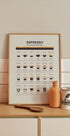 Ein detailliertes Espresso-Poster mit einer illustrierten Übersicht klassischer italienischer Kaffeegetränke. Von Espresso und Doppio bis hin zu Cappuccino, Latte und Affogato – dieses Küchenposter ist sowohl lehrreich als auch stilvoll. Perfekte Wandkunst für Cafés, Cafés und Heimküchen.
