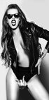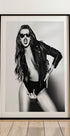 Ein kühnes und ausgefallenes Schwarz-Weiß-Porträt einer Frau in Lederjacke und Sonnenbrille, das Selbstvertrauen und Haltung ausstrahlt. Dieses auffällige, von der Mode inspirierte Kunstwerk vereint Sinnlichkeit, Rebellion und Glamour und eignet sich perfekt für moderne Innenräume, Modebereiche oder als zeitgenössisches Wandkunst-Statement.