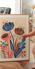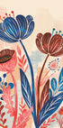 Eine lebendige botanische Illustration mit kräftigen roten, blauen und erdfarbenen Blumen vor einem weichen, strukturierten Hintergrund. Die lebendige Mischung aus Farben und organischen Formen verleiht Wärme und Charme – ein perfektes Stück, um Küchen, Wohnzimmer oder eine moderne Galeriewand aufzuhellen.