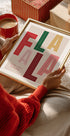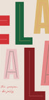 Singen Sie es laut: Fa La La in jubelnder, gestapelter Schrift platzt über die Seite mit Stechpalmenrot, Kieferngrün, Beerenrosa und goldenen Akzenten. Dieses verspielte typografische Design greift das klassische Weihnachtslied auf und bringt moderne, festliche Energie in Flure, Kaminsimse und Galeriewände – fröhlich, hell, unverkennbar festlich. Lass es an deiner Wand singen.