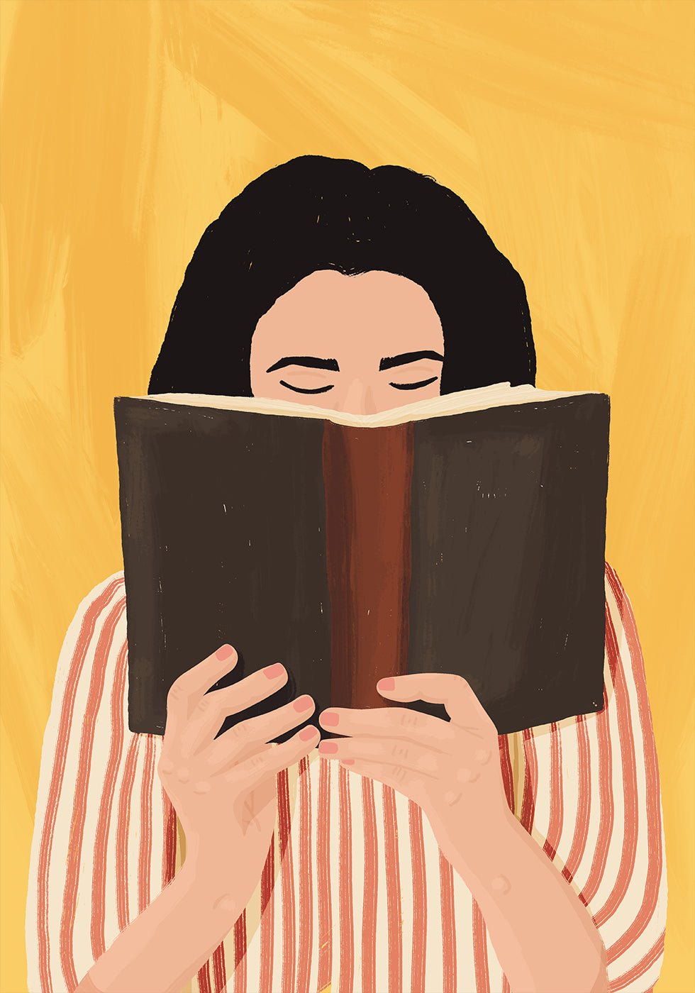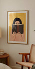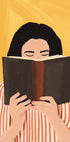 Eine warme und einladende Illustration einer Frau, die tief in ein Buch vertieft ist, vor einem satten gelben Hintergrund. Das gestreifte Hemd und die Erdtöne sorgen für einen gemütlichen, modernen Charme – perfekt für Leseecken, Bibliotheken oder jeden Raum, der die Freude an Büchern feiert.