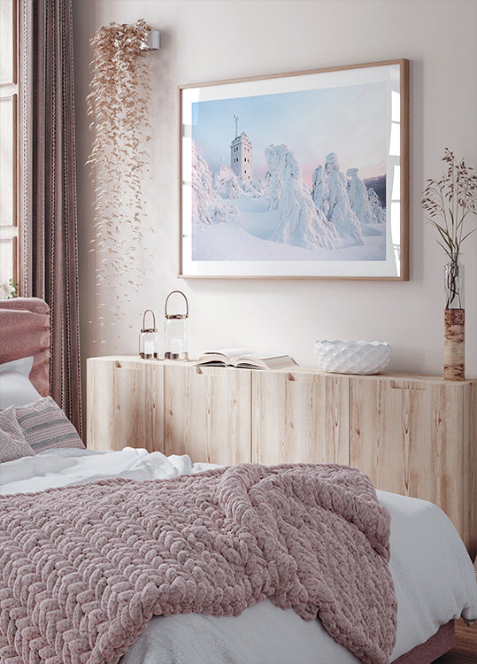 Der Fichtelberg im Wintergewand: Über den schneebedeckten Bäumen des Erzgebirges erhebt sich ein frostbedeckter Aussichtsturm, während der Horizont im kühlen Nebel verschwindet. Der Kontrast zwischen eisigen Strukturen und weichem Schnee erzeugt Ruhe und Dramatik zugleich. Das Motiv stammt vom Fotografen Christoph Schaarschmidt. Ein stimmungsvolles Wintermotiv aus dem deutschen Erzgebirge.