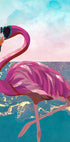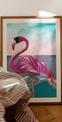 Ein verspieltes und farbenfrohes Kunstposter mit einem rosa Flamingo mit schicker herzförmiger Sonnenbrille am Meer. Mit kräftigen Rosa-, Blau- und Magentatönen versprüht diese tropische Illustration Urlaubsstimmung und Sommerspaß – perfekt für Strandliebhaber.