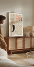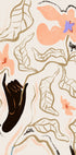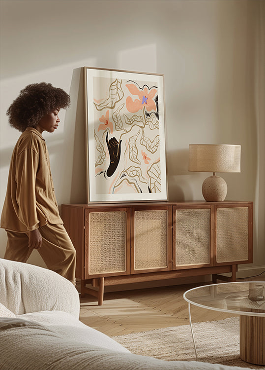 Ein modernes abstraktes Kunstwerk mit handgezeichneten Blumen in warmen Pfirsich- und Aprikosentönen. Die figurative schwarze Hand schafft Kontrast und Tiefe und stellt eine poetische Verbindung zwischen Mensch und Natur her. Dieses ausdrucksstarke botanische Motiv verbindet modernen Landhausstil mit künstlerischem Minimalismus und eignet sich ideal als Wandkunst.