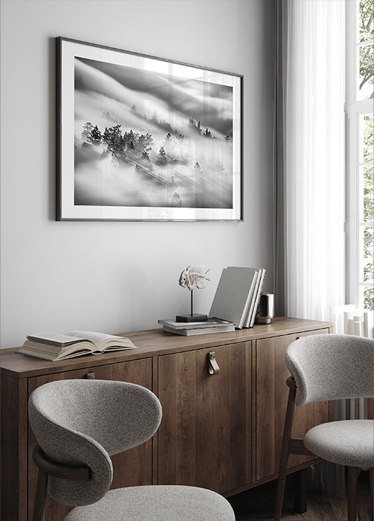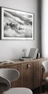 Eine zeitlose, monochrome Landschaftsszene von Johnny Zhang: Nebel schwebt zwischen schneebedeckten Berghängen und dunklen Kiefern, wo Himmel und Horizont in stiller Gelassenheit verschmelzen. Die Kontraste sind weich, die Linien klar und das Motiv fängt die Poesie des Winters ein – ein ruhiger Mittelpunkt für Räume, die Balance und Tiefe suchen.