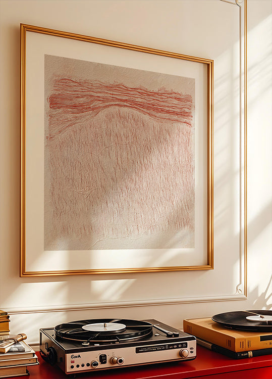 Flüsternde Texturen von Alma bewegt sich zwischen Küste und Land: sanfte Kreidestriche, feine Linien und geschichtete, matte Waschungen in Beige, gebrannten Rottönen und sanften Erdtönen. Ein minimalistischer Japandi-Geist ruft ruhige Horizonte und Retro-Wärme hervor und lässt strukturierte Formen und ruhige negative Räume zum langsamen, beruhigenden Nachdenken einladen.