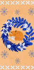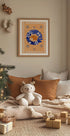 Eine bezaubernde Winterillustration eines warmen orangefarbenen Fuchses, umgeben von einem volkstümlich inspirierten Kranz aus blaugrünen Blättern, roten Beeren und zarten Blumen. Schneeflocken tanzen in einer indigofarbenen Nacht und sorgen für eine gemütliche, märchenhafte Atmosphäre. Erstellt von der Künstlerin Aliya Putrus – perfekt für Kinderzimmer und Winterhäuser. Eine süße Geschenkidee in den Farben von Weihnachten.