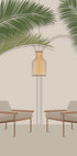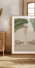 Diese friedliche tropische Lounge-Szene fängt einen ruhigen Moment der Präsenz und Erholung vom Lärm des Alltags ein. Umgeben von wiegenden grünen Palmblättern und in sanftes natürliches Licht getaucht, stehen zwei minimalistische Sessel unter einer warmen Pendellampe – und laden zum Nachdenken, geselligen Beisammensein oder entspanntem Ausruhen ein. Mit erdigen Farbtönen und einer luftigen botanischen Atmosphäre erweckt das Werk ein Gefühl entspannter Zurückgezogenheit. Perfekt für Galeriewände oder Leseecken, die mediterran inspirierte Ruhe wünschen.
