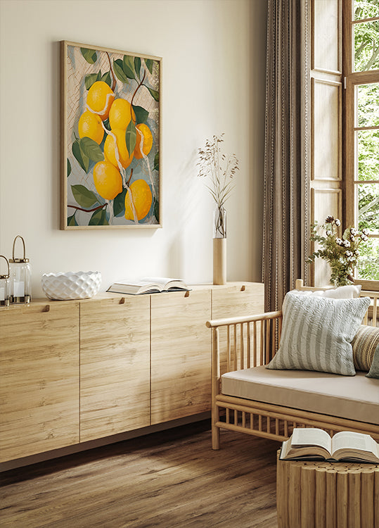 Eine farbenfrohe Illustration reifer gelber Zitronen, umschlungen von einem weichen Netz aus grünen Blättern. Ein sommerliches und mediterran inspiriertes Motiv – ideal für die Küche oder gemütliche Ecken.