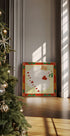 Senden Sie herzliche Weihnachtswünsche mit dieser fröhlichen Illustration von Dirkie Nell: Eine anmutige weiße Taube gleitet über einen kräftigen roten Hintergrund, trägt einen Mistelzweig und verspielte Herzen als Schleppleine. Retro-Boho-Details und charmante handgezeichnete Schriftzüge verkünden fröhliche Weihnachten in fröhlichem Stil. Perfekt für eine gemütliche Winterdekoration und herzliche Geschenke.