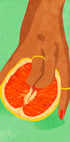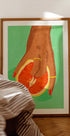 Grapefruit-Touch-Poster ist ein markantes und provokantes modernes Kunstwerk, das Themen wie Sinnlichkeit, Stärke und spielerische Rebellion erforscht. Es zeigt eine Hand mit tiefbrauner Haut, geschmückt mit goldenen Ringen und auffällig rot lackierten Nägeln, die in einer symbolischen und suggestiven Geste eine halbierte Grapefruit umrahmt. Auf einem frischen, strukturierten grünen Hintergrund bilden die warmen Töne der Hand und der Früchte einen faszinierenden Kontrast. Dieses mutige Stück ist perfekt für moderne Räume, die Körperpositivität, Selbstausdruck und bedingungsloses Selbstvertrauen fördern.