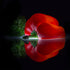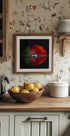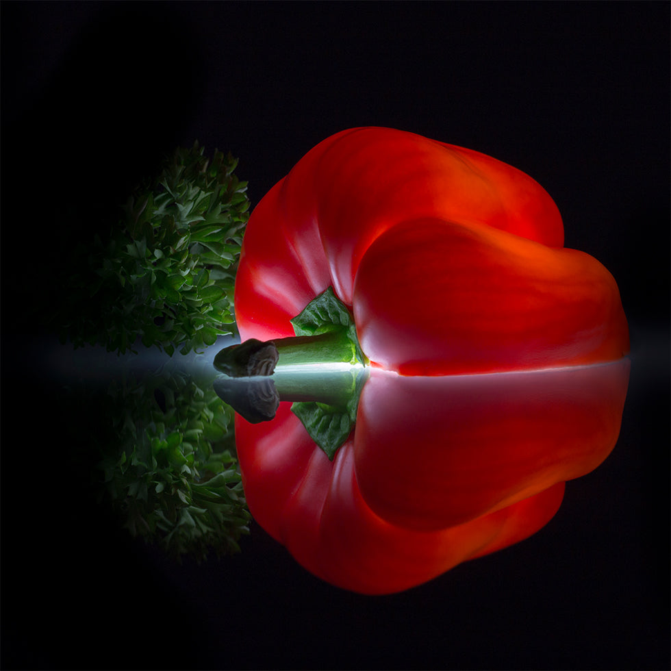 Ein saftiger roter Paprika liegt frisch gehackt auf einer glänzenden, spiegelnden Oberfläche, wo Licht und Schatten eine ruhige, moderne Komposition ergeben. Die frischen Samenstücke und scharfen Kanten sorgen für Energie, während der saubere Hintergrund für Ausgewogenheit sorgt. Ein stilvolles Küchenmotiv von Wieteke de Kogel, perfekt für gastronomische Räume. Und alltägliche Poesie.