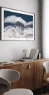 In klaren Blautönen entfaltet sich eine ruhige Winterlandschaft: Majestätische schneebedeckte Gipfel erheben sich über nebligen Tälern, während sanfte Wolken über den Himmel ziehen. Die saubere, kühle Atmosphäre lädt zum Nachdenken und zur Ruhe ein. Ein poetischer Blick auf die Kraft und Stille der Berge, geschaffen von Xiaoyang Wang. Perfekt als ruhiger Mittelpunkt im Wohnzimmer.