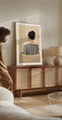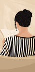 Eine warme und einladende Illustration einer Frau, die in einem gestreiften Oberteil von hinten liest. Die sanften Beigetöne und die entspannte Stimmung schaffen eine beruhigende Ästhetik und machen es zum perfekten Stück für Schlafzimmer, Wohnzimmer oder Leseecken – ideal für alle, die ruhige Momente und gemütliche Räume lieben.