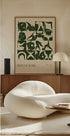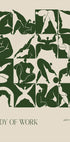 Ein auffälliges figuratives Poster von Arty Guava (2024) mit kräftigen abstrakten Körperformen in tiefem Grün auf beigem Hintergrund. Das Kunstwerk erforscht Form, Bewegung und menschlichen Ausdruck in einem modernen Grafikstil.