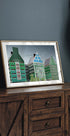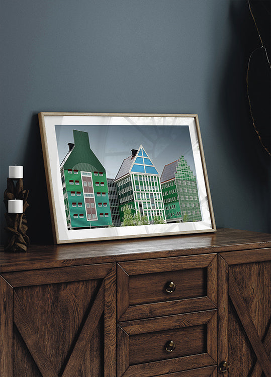 Renate Reichert fängt die ikonische grüne Fassade von Zaandam in einem grafischen, geometrischen Spiel aus Fenstern, Linien und Schatten ein. Gestapelte Hausmotive bilden ein rhythmisches Mosaik, dessen Perspektive den Blick nach oben auf die Skyline der Stadt lenkt. Ein urbaner Hingucker, der Architektur, Muster und holländischen Charme vereint. Inspiriert von den Stapelhausfassaden des Inntel Hotels.
