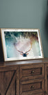 Ein verträumter surrealistischer Kunstdruck, der die majestätische Silhouette eines Hirsches mit einer nebligen Waldlandschaft kombiniert. Diese Doppelbelichtungsarbeit vermittelt eine spirituelle und mystische Atmosphäre. Perfekt, um dem Zuhause ein Gefühl von Fantasie und Wildnis zu verleihen.