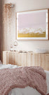 Goldene Berggipfel erheben sich in einer grafischen, hellen Winterlandschaft, in der Schnee und Frost scharfe Linien vor dem warmen Licht zeichnen. Abstrakte Formen bilden rhythmische Schichten aus Hügeln und Gipfeln, die gleichzeitig Ruhe und Dramatik erzeugen. Ein elegantes, nordisches Motiv von Gemma Bardot, das Kälte, Glanz und stille Erhabenheit einfängt.