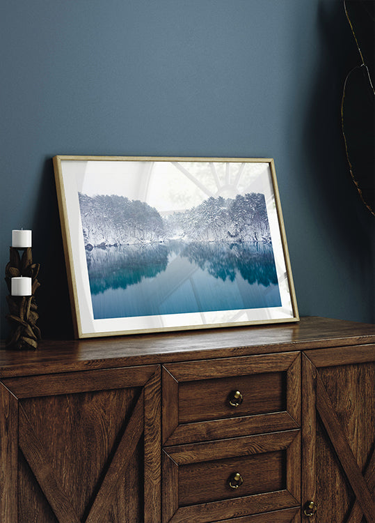 Ein ruhiger Wintermoment in Goshiki-numa in Urabandai: Nebel schwebt über dem zugefrorenen See, die Silhouetten der Tannen spiegeln sich im eisigen Wasser und eine dünne Schneeschicht dämpft alle Geräusche. Sasaki Makoto fängt die poetische Ruhe der Natur und die subtilen Blaugrautöne ein, die zum Nachdenken einladen. Ein stiller Begleiter für die ruhigsten Ecken des Hauses.