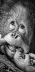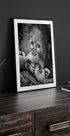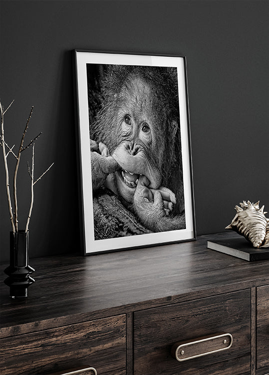 Ein humorvolles und herzerwärmendes Schwarz-Weiß-Porträt eines jungen Primaten mit verspieltem Gesichtsausdruck. Das Bild fängt Freude, Unschuld und ein freches Lächeln ein und verleiht jeder Wand Wärme und Humor.