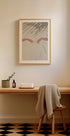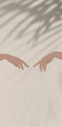 Eine ruhige und poetische Komposition, die zwei sanft ausgestreckte Hände zeigt, die sich einander entgegenstrecken, vor einem ruhigen beigen Hintergrund mit eleganten Palmblattschatten. Dieses minimalistische Kunstwerk ruft Themen wie Verbindung, Frieden und Ausgeglichenheit hervor – ideal, um eine ruhige und nachdenkliche Atmosphäre in Ihrem Raum zu schaffen.