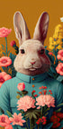 Ein fantasievolles und bezauberndes Poster mit einem Hasen in türkisfarbener Jacke, umgeben von blühenden Blumen. Die verspielte Komposition kombiniert Vintage-Illustration mit surrealer Fantasie, perfekt für das Kinderzimmer, das Spielzimmer oder für alle, die humorvolle Tierporträts lieben.