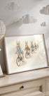 Eine bezaubernde und nostalgische Illustration süßer Hasen auf Fahrrädern, die kleine Jacken tragen. Dieses Poster bringt eine verspielte und elegante Atmosphäre ins Kinderzimmer. Perfekt als Geschenk für Babypartys, Geburtstage oder für alle, die Tiere und abenteuerliche Kunst lieben.