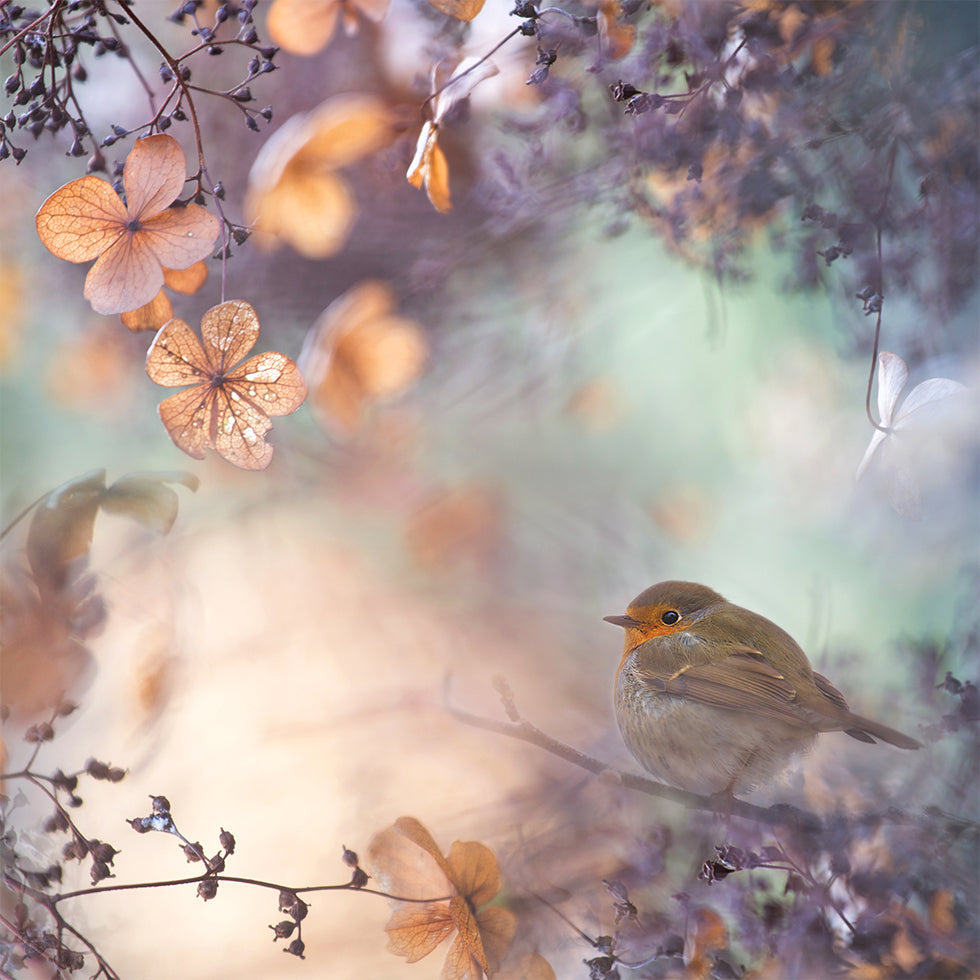 Hydrangea Fantasy von Teuni zeigt eine kleine Rothaarige inmitten frostgeküsster Hortensien, gebadet in sanftes Bokeh und leichten Schnee. Pastellfarben und sanftes Licht verleihen dem Motiv eine verträumte, abenteuerliche Aura, in der die Poesie der Natur auf den stillen Zauber des Winters trifft und zur inneren Ruhe einlädt. Ein poetischer Blickfang für botanische Seelen.