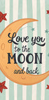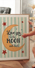 Ein poetisches Poster mit dem beliebten Zitat „Love you to the Moon and Back“ in eleganter Typografie, umgeben von einem leuchtenden Mond, verstreuten Sternen und den tiefen Farbtönen des Nachthimmels. Das Motiv strahlt Ruhe, Wärme und kosmischen Charme aus und fängt das Gefühl grenzenloser Liebe in einem schlichten, modernen Ausdruck ein. Perfekt für ruhige Ecken, Schlaf- und Kinderzimmer.